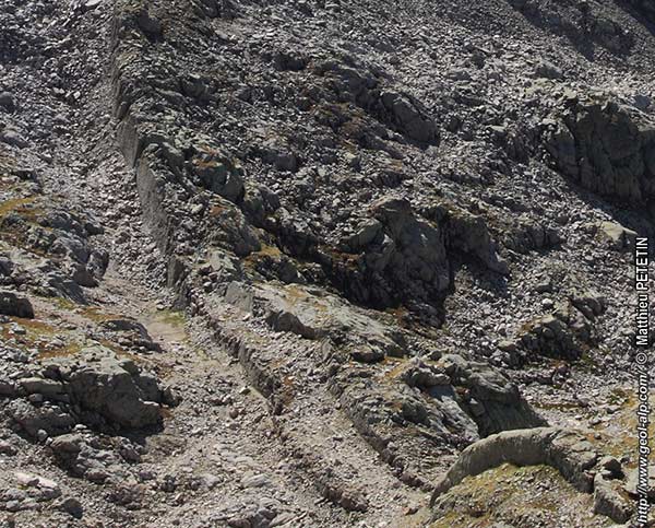 Les roches moutonnées situées plus en amont se montrent traversées, transversalement au vallon, par deux lignes parallèles d'escarpement, de hauteur métrique, ressemblant donc chacune à un muret, qui sont visiblement des miroirs de faille (cette cassure est bien figurée sur la carte géologique au 1/50.000°, mais ses particularités n'étaient pas indiquées : elles m'ont été signalées par Mr M. Petetin). |