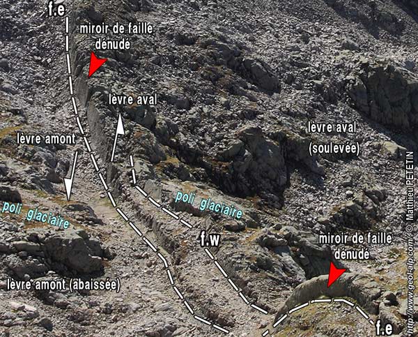 La surface du miroir de ces failles est très fraîche et la hauteur selon laquelle elle est dénudée varie assez peu sur toute leur longueur, ce qui témoigne d'une très faible attaque de l'érosion ; leur lèvre abaissée, située du côté amont, bute contre le miroir en déterminant un sillon : celui-ci ne résulte pas d'un dégagement par l'érosion d'un matériau qui aurait été plus "tendre", mais de ce que la surface topographique y a été abaissée. Ces deux caractères indiquent que ces cassures ont décalé la surface topographique quaternaire (préalablement rabotée par le glacier qui a occupé le vallon). Il s'agit donc de failles quaternaires (d'âge post-glaciaire) bien caractérisées. |