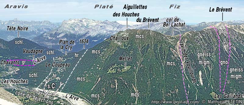 Au sud du Brévent toute la lourde échine des Aiguillettes du Brévent et des Houches est formée de gneiss plaquetés plus ou moins migmatisés et de micaschistes ; ces derniers sont recouverts dans les pentes inférieures (au niveau du Plan de la Cry) par des grès et pélites du Houiller qui occupent là un fossé sédimentaire à peu près N-S qui détermine la vallon du Coupeau et se poursuit vers le nord jusqu'au débouché des gorges de la Diosaz.