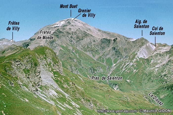 1 - le versant oriental (rive gauche) continue à être entaillé dans le socle cristallin (voir les pages "Buet" et "Brévent"). Le torrent ne traverse la surface de la pénéplaine anté-triasique qu'au niveau des chalets de Villy et prend sa source, immédiatement en amont, dans l'éventail de ravines qui rayonne dans les couches sédimentaires de l'épaule sud-occidentale du Buet (ou Grenier de Villy). Ce dernier sommet se rattache donc, par ses roches et sa structure, au massif du Haut Giffre (couverture sédimentaire déplacée par charriage), tandis que les sommets moins élevés qui forment ses arc-boutants orientaux (Aiguille de Bérard, Mont Oreb), bien que situés au nord-ouest de la profonde vallée de Bérard, se rattachent au massif cristallin des Aiguilles Rouges.