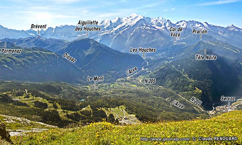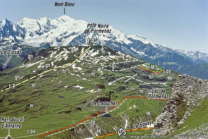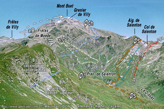 ![]() Le haut vallon de la Diosaz vu du sud-ouest, depuis l'Aiguillette des Houches s.pa = surface de la pénéplaine anté-triasique ; ØS = surface de charriage subalpine "de la nappe de Morcles". ØA = amorce du chevauchement d'Anterne ; ØCh = chevauchement du col des Chaux (il occasionne le redoublement du Jurassique du Buet) (concernant ces deux accidents voir la page "Buet") ; "M" = marbres du Jurassique supérieur . f.Arlevé = faille d'Arlevé (commentaires à la page "Brévent"). |
