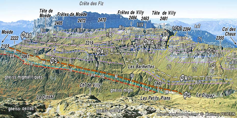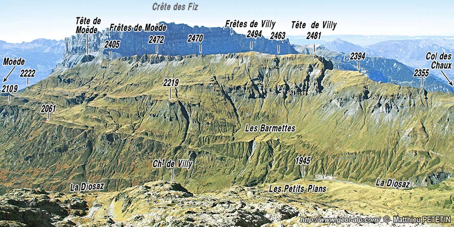 Les pentes méridionales de cette crête, que traverse le sentier qui s'élève du sud depuis le refuge du col (au fond du vallon de Moëde), donnent une coupe totale de la succession stratigraphique jurassique jusqu'à son chevauchement basal (dit "de la nappe de Morcles"). Elles montrent que cette dernière y est affectée par un redoublement que l'on peut appeler le chevauchement de Moëde. Passagèrement masqué, plus à l'ouest sous les éboulis tombant de la Pointe d'Anterne du col d'Anterne réapparaît, dans ce versant, dans les ravines à l'amont des chalets du Souay (voir la page "Fiz").