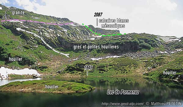 Sur le flanc ouest de la montagne, immédiatement au sud du lac de Pormenaz, affleure une galette rocheuse de quelques centaines de mètres de côté qui est formée de calcaires blancs assez massifs qui reposent sur les couches du Houiller, pratiquement sans différence de pendage ("en accordance") et par l'intermédiaire de lits de grès vraisemblablement triasique. Ces calcaires ont un aspect assez proche de ceux, datés du Jurassique terminal que l'on trouve tout le long de la bordure occidentale du massif des Aiguilles Rouges, en accordance sur des couches triasiques depuis les affleurements du ravin du Souay (immédiatement plus au nord) jusqu'à Salanfe (beaucoup plus au nord-est).