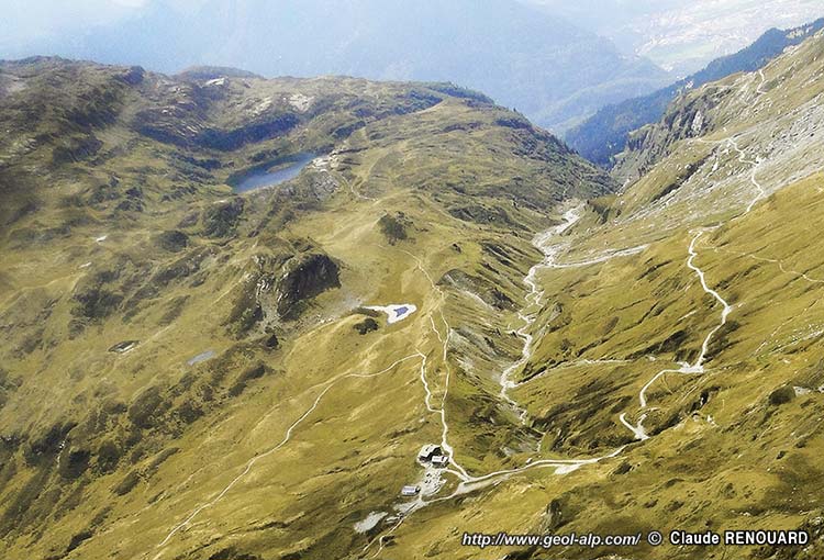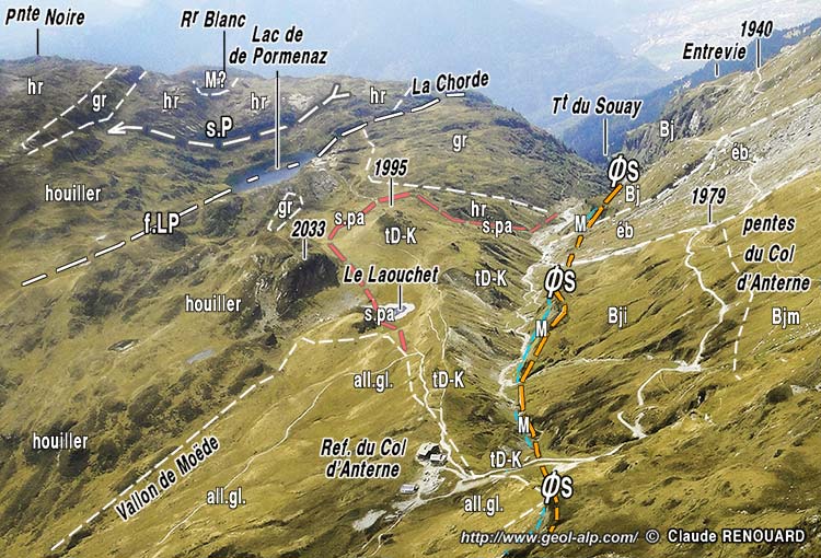 L'un comme l'autre ont leur tracé guidé plus ou moins exactement par le contact du sédimentaire subalpin sur le socle des Aiguilles Rouges : il suit à quelques distance en contrebas le pied de la crête qui constitue la limite d'écoulement des eaux (son autre versant donnant sur la vallée du Giffre). Comme le plus souvent au flanc ouest de ce massif les sédiments débutent par des grès triasiques transgressifs qui supportent des couches dolomitiques, elles même séparées du Bajocien surincombant par une lame de calcaires clairs, datés du Jurassique supérieur. La présence de cette dernière impose d'y voir un chevauchement tectonique interprétable comme celui de la base de la succession subalpine de la "nappe de Morcles". Selon les auteurs ces couches sont rattachées à une lame charriée renversée à la base de la nappe (hypothèse d'un flanc renversé réduit par biseautage) ou à un autochtone réduit transgressif sur le Trias (hypothèse plus volontiers retenue dans ce site).