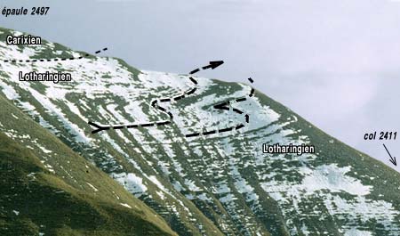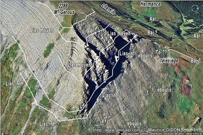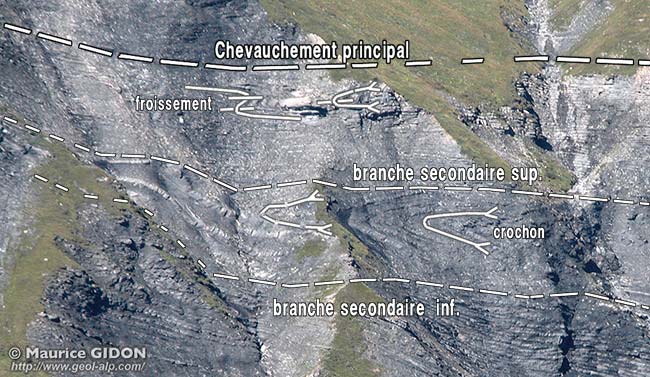 Quant à la place de ce chevauchement dans le schéma tectonique général elle n'est pas évidente en raison du fait que ses prolongements sont masqués vers le haut comme vers le bas. La disposition du plan de cassure le conduit apparemment à se prolonger vers le haut en suivant le pied des abrupts le plus septentrionaux du Mont Géroux, ce qui porte à se demander s'il ne pourrait pas s'agir d'une cassure satellite associée au chevauchement basal de l'unité du Mont Joly (voir le cliché d'ensemble en début de la présente page) |