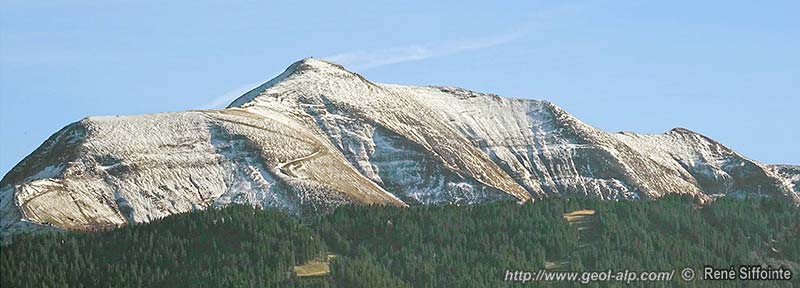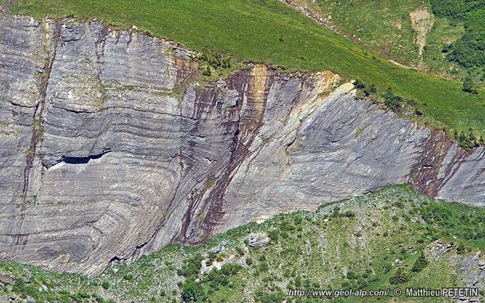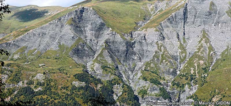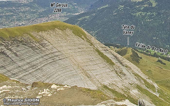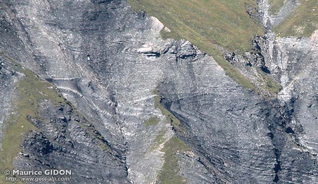 Détail de la partie médiane du versant ci-dessus vu du nord, depuis le Mont Joux On voit clairement qu'il ne s'agit pas de la charnière d'un pli couché, mais de plissotis de couches au sein d'un flanc normal (l'angle aigu entre l'orientation du versant, proche de N-S et celle de leur axe, voisine de N45, leur donne ici une apparence plus déversée qu'il n'en est réellement). Il s'agit d'une bande de froissement par cisaillement, comparable, en plus grand, aux petites bandes froissées visibles sous le sommet même (cf. ci-dessus). |