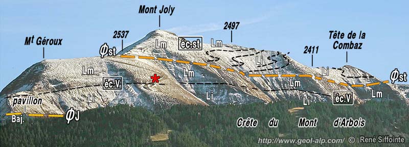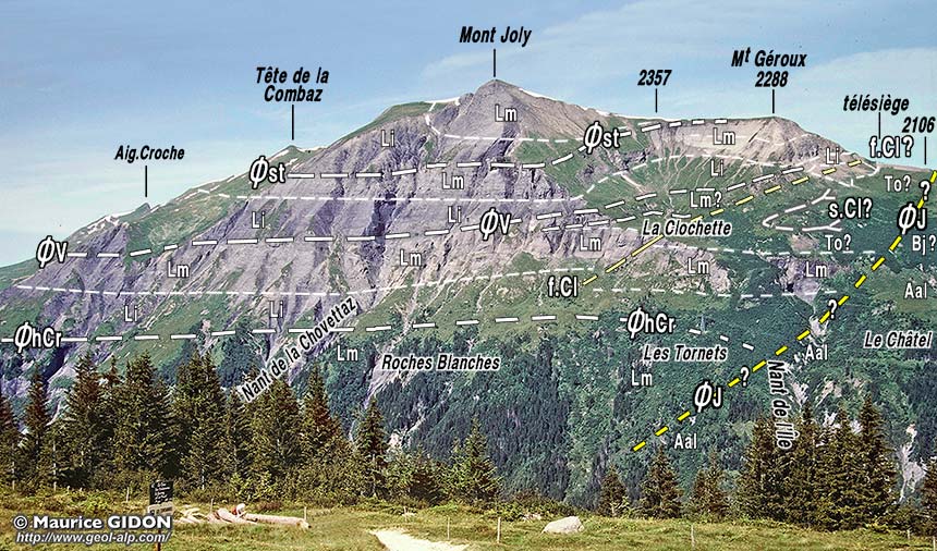 Dans ce contexte l'échine qui descend du sommet du Joly vers le Mont Joux en passant par le Mont Géroux a paru à cet auteur fournir la coupe clef de la structure. En effet il a cru voir, dans l'ample voussure que dessinent les bancs de ce dernier sommet, le flanc normal d'un anticlinal couché dessiné par le Lias moyen. Ce pli serait doté d'un flanc inverse reposant en contact stratigraphique, par l'intermédiaire de niveaux attribués au Toarcien, sur l'Aalénien du Mont Joux (lui-même représentant là le flanc inverse d'un grand synclinal du Mont d'Arbois, dont l'existence n'est d'ailleurs que supposée). Il représenterait l'anticlinal médian d'un "faisceau" de plis couchés (c'est-à-dire d'un anticlinorium* couché).