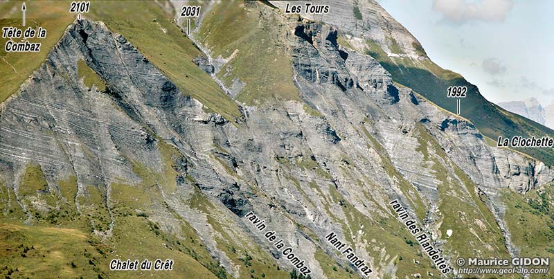 Dans ce versant de la montagne les grandes surfaces qui ont été dénudées par les ravinements permettent, depuis le versant opposé de la vallée du Bon Nant, de suivre avec précision le tracé des strates. Celui-ci a donc été surligné sur une série de clichés de la qualité que permettent les appareils actuels, c'est-à-dire dont la définition est suffisante pour les y repérer. On trouvera sur la photo d'ensemble du versant, à la page "Mont Joly", la localisation des secteurs analysés dans les clichés ci-après (lesquels sont des réductions des clichés ayant servi au travail exploratoire).