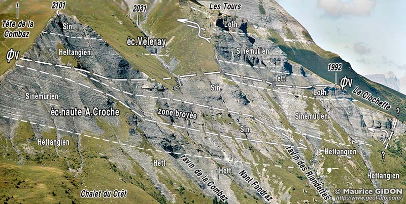 L'analyse détaillée du tracé des strates dans les versants de ces ravins permet d'y voir des figures qui caractérisent clairement des surfaces de chevauchement à vergence vers le NW (c'est-à-dire presque perpendiculaire à la surface topographique du versant). Elle confirment que la tranche dite "écaille du Véleray" est en contact tectonique sur la tranche sous-jacente dite "écaille haute de l'Aiguille Croche".