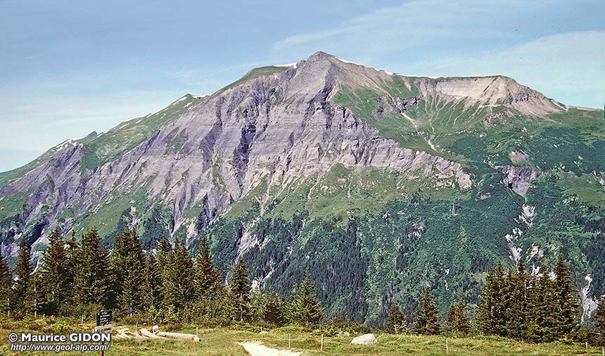On y constate déjà la vue de la montagne à distance sous cet angle n'incite vraiment pas à suivre l'interprétation par un faisceau de plis proposée par Epard : l'on est frappé au contraire par le manque de toute charnière de renversement qui soit visible (notamment aux emplacements où leur présence est supposée) autant que par le long parallélisme N-S des bandes de strates qui parcourent presque horizontalement le versant. L'invraisemblance de la valeur synclinale des bandes de Lias moyen y semble déjà flagrante.