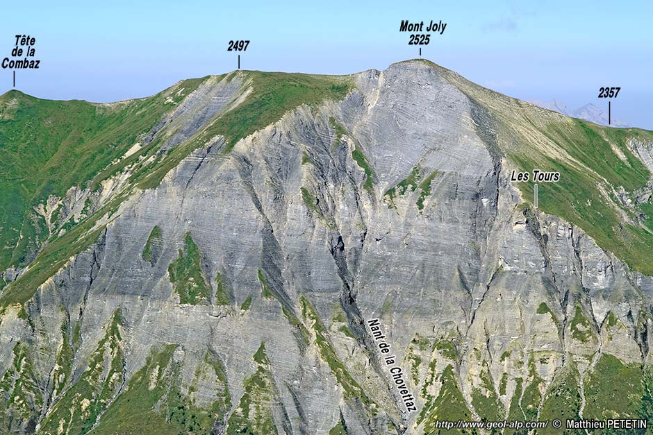 En fait de tels plis déversés dont le flanc basculé a une longueur bien inférieure à celle de leur flanc normal sont assez communs. On en voit notamment d'autres exemples dans les abrupts orientaux du sommet du Mont Joly (voir le premier cliché ci-après). Mais tous indiquent un cisaillement à vergence nord. Or une structure en plis couchés devrait comporter des niveaux à disposition inverse, c'est-à-dire à flancs courts déversés vers le sud (voir à ce sujet la rubrique "anticlinorum")