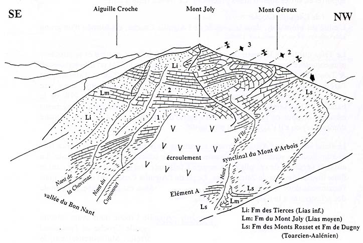Le dernier auteur ayant analysé la structure du Mont Joly avant la rédaction de la présente page est J.-L. Epard (1990). Il a fondé son interprétation sur la comparaison entre la coupe de l'arête septentrionale de son sommet avec celle de la crête du col de Voza, en rive opposée (rive droite) du Bon Nant. Cela lui a fait reconnaître dans les schistes aaléniens de la crête de La Joux (au nord du Joly) l'équivalent de ceux du col de Voza et à voir dans leurs affleurements le cœur d'un synclinal du Mont d'Arbois prolongeant celui de Chamonix. Il a donc été amené à essayer de retrouver, dans les répétition de niveaux calcaires du Lias du Joly, les larges plis que dessine ces mêmes niveaux dans le Mont Vorassay (E. Paréjas, 1925), ce qui l'a conduit à y dessiner des plis déversés vers le NW qui devraient être plus ou moins transversaux à la crête du Joly (voir son croquis ci-dessous).