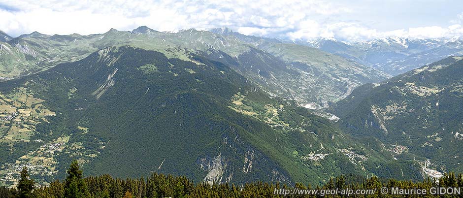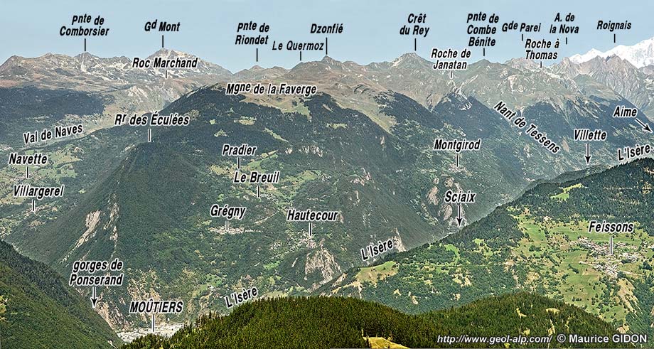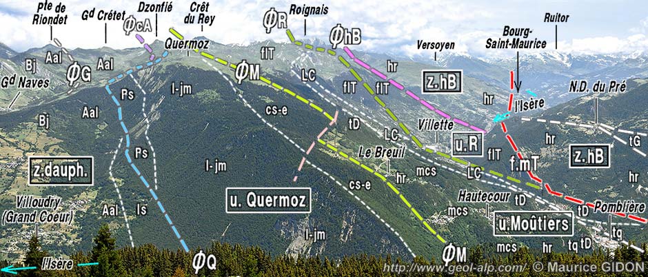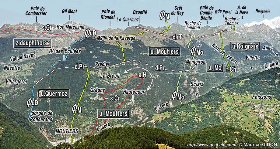 ![]() Le Beaufortain oriental : vue d'ensemble, du sud, depuis Longecha (arête nord de Crève Tête, au sud de Moutiers). ØG = surface de chevauchement (?) de l'Unité de la crête des Gittes (voir la remarque ci-après) ; ØcA = surface de chevauchement de l'Unité du Cormet d'Arêches ; ØQ = surface de chevauchement de l'Unité ultra-dauphinoise du Quermoz ; ØM = surface de chevauchement de l'Unité valaisanne de Moûtiers ; ØR = limite occidentale de l'Unité valaisanne du Roignais (faille de Centron) ; ØhB = surface de chevauchement de la Zone du houillère briançonnaise (Z.hB); f.mT = faille de la moyenne Tarentaise. |