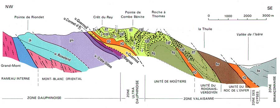 ![]() Coupe du Beaufortain oriental à l'est d'Arêches (d'après la notice de la carte au 1/50.000° Bourg-Saint-Maurice, présentation fortement retouchée) js = Jurassique supérieur de l'Unité de Roselend ; jm = Jurassique moyen de l'Unité de la crête des Gittes ; tG = surfaces tectoniques jalonnées de trias gypsifère ; Tr = Trias carbonaté de la zone valaisanne ; j = Lias et Dogger de la zone valaisanne ; cgl = conglomérats de base du flysch de Tarentaise ; flT = flysch de Tarentaise ; hr = grès et schistes houillers. N.B. : c'est par erreur que ce dessin indique la présence de quartzites décrivant un vaste anticlinal dans le soubassement de la Roche à Thomas (voir la page "Roche à Thomas"). |