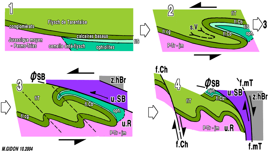 compressive (partie gauche = future unité du Roignais ; partie droite = future unité du Versoyen) ; 2 = formation du synclinal couché