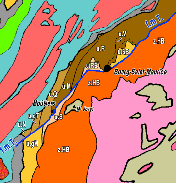Carte structurale schématique de la moyenne Tarentaise La faille de la moyenne Tarentaise (f.m.T) est représentée par le trait bleu Partie ultradauphinoise de la zone des brèches de Tarentaise (en beige) : u.N = unité du Niélard ; u.cT = unité de Créve Tête ; u.Q = unité du Quermoz (y inclus les unités du Cormet d'Arèches et de La Bagnaz) ; Partie valaisane de la zone des brèches de Tarentaise (en brun) : u.M = unité de Moutiers ; u.R = unité du Roignais ; u.V = unité du Versoyen. Zone subbriançonnaise (en jaune) : u.gM = unité de la Grande Moendaz ; u.SB = unité du Petit Saint-Bernard ; u.S = unité de Salins ; u.RE = unité du Roc de l'Enfer ; z.HB (en orangé) = zone houillère briançonnaise (légende des couleurs comme pour le schéma structural des Alpes, sauf pour le détail des unités valaisanes). |