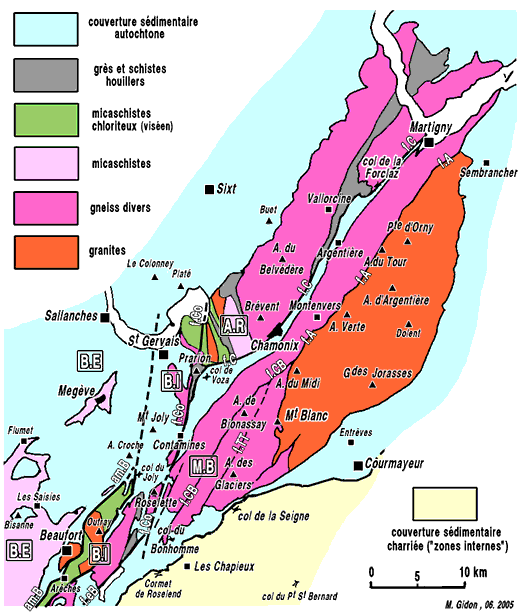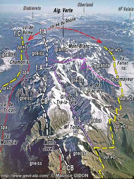 septentrionale du val de Chamonix. Contrairement à ce qui est écrit dans la notice de la carte géologique Chamonix à 1/50.000° rien n'autorise à affirmer que le socle cristallin du Mont Blanc est charrié, au contraire ! En effet le décalage à prendre en compte pour déterminer le rejet de l'accident de la vallée de Chamonix est celui de la surface de la pénéplaine anté-triasique ; or il est clairement extensif puisque, du côté Mont Blanc, cette surface plonge sous le fond alluvial de la vallée avec un pendage tel qu'elle ne saurait buter contre la surface de cassure qu'au moins 1000 m en contrebas, soit 4000 m plus bas que la même surface à la voûte du bloc des Aiguilles Rouges (et encore n'est-ce qu'une estimation minimale). Le surhaussement de la voûte du bloc du Mont Blanc par rapport à celui des Aiguilles Rouges n'est donc pas dû à un chevauchement mais à la plus forte importance, dans le premier de ces deux massifs, du bombement qui a déformé cette pénéplaine anté-triasique. |