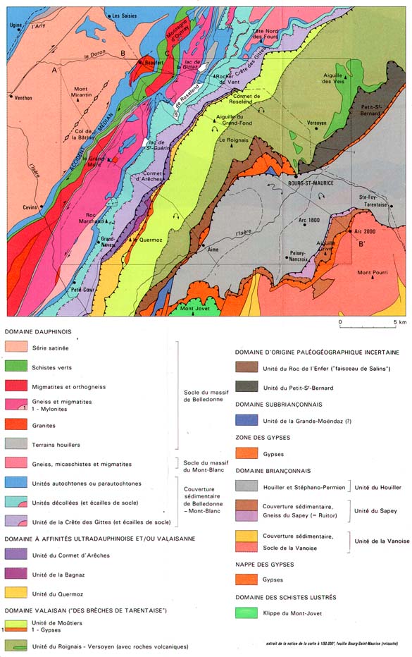 voir les commentaires détaillés sur les diverses unités à la page "Beaufortain oriental" NB : L'unité de Roselend, première unité chevauchante ("parautochtone") de l'autochtone dauphinois interne est rangée dans les "unités décollées" de la légende, avec l'"unité de la Roche Parstire - Roc Marchand". Dans la notice de la carte Bourg-Saint-Maurice elle est appelée "écaille de la Gitte". Mais ce terme prète à confusion avec l'"unité de la crête des Gittes" immédiatement plus interne. L'unité de Roselend ainsi définie est en outre distincte de l"unité de Roselend" de P.LANDRY (1976), pour qui ce terme désignait la couverture sédimentaire autochtone du rameau interne de Belledonne ("unités autochtones" de la présente légende) |