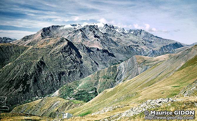 Le revers oriental du massif des Grandes Rousses vu du sud-est, depuis les pentes montant de Cuculet vers le Jandri