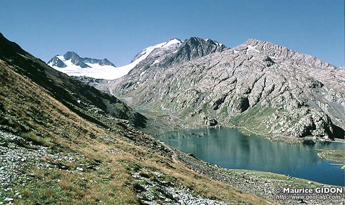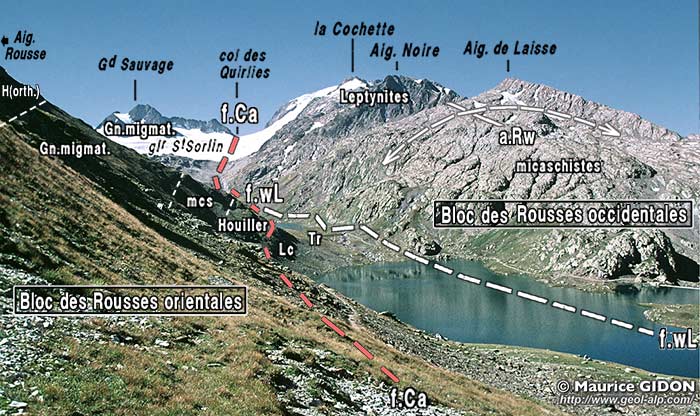 ![]() Le Lac Bramant et la partie méridionale de la dépression des lacs, vus du nord-ouest, depuis la rive orientale du Grand Lac (= Lac Bramant). f.Ca = limite occidentale du bloc de Cassini (prolongement septentrional de la faille de Cassini) ; f.wL = faille occidentale des Lacs de Saint-Sorlin ; a.Rw = anticlinal des Rousses occidentales. Dans ce secteur les lambeaux de terrains sédimentaires qui ont échappé à l'érosion forment des affleurements très discontinus et le cristallin est presque partout dénudé. On notera l'allure en coupole à peine ciselée de sillons étroits qu'affecte sa surface topographique en avant et à droite de l'Aiguille de Laisse : cela correspond à la dénudation de l'ancienne surface de la pénéplaine anté-triasique. Les lacs résultent d'un surcreusement glaciaire par une ancienne langue (würmienne) du glacier de Saint-Sorlin. Les pentes qui les dominent témoignent par leur patine claire (due à l'absence de colonisation végétale) qu'elles ont été occupé par des neiges permanentes jusqu'à une date récente : celles de l'Aiguille de Laisse notamment ont dû constituer (sans doute au XVIII° siècle) une coupole glaciaire comparable en plus petit à celle de Chasseforêt, en Vanoise. |