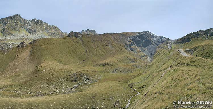 ![]() Le vallon des chalets d'Olle (extrémité septentrionale de la dépression des lacs de Saint-Sorlin) vu du nord, depuis la D926, 1 km au nord-ouest du col de la Croix-de-Fer. (voir commentaires et compléments à la page Glandon). |