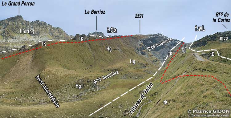 Le contenu du graben des lacs s'épanouit enfin, du côté nord, aux abords ouest du col de la Croix-de-Fer. en se raccordant au reste de la couverture sédimentaire, sous laquelle le socle cristallin s'enfonce au nord de l'Eau dOlle (pentes de Bellard et de l'Ouillon).