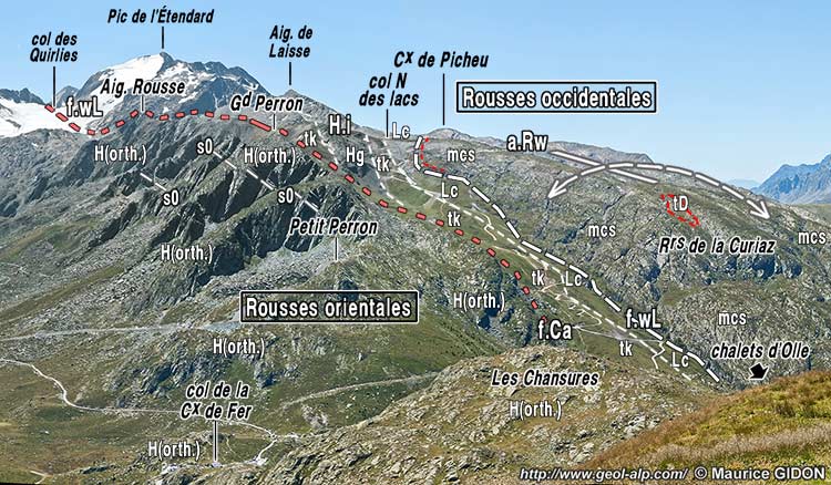 ![]() L'extrémité septentrionale du massif des Grandes Rousses vue du nord-ouest, depuis le sommet du Rocher Blanc des Sept Laux. La flèche rouge se situe à l'emplacement des lacs inférieurs de Saint-Sorlin (Lac Blanc et Grand Lac) ; son sens indique l'abaissement progressif, vers le nord, de la voûte du bloc de socle cristallin des Grandes Rousses. a.mR = sillon de l'accident médian des Grandes Rousses (il est masqué par l'échine de la Croix de Picheu). f.LB = faille du Lac Blanc (faille extensive jurassique accidentant le flanc ouest du bloc des Grandes Rousses) ; f.BE = faille bordière orientale de Belledonne. Le contact du Trias sur le socle cristallin est marqué en tirets rouges sur le flanc occidental de la voûte du cristallin. Cette surface de la pénéplaine anté-triasique est dénudée et doucement arrondie à gauche de la Croix de Picheu (emplacement de la flèche rouge). (suite de ce cliché vers la droite à la page "Pic de l'Étendard") |