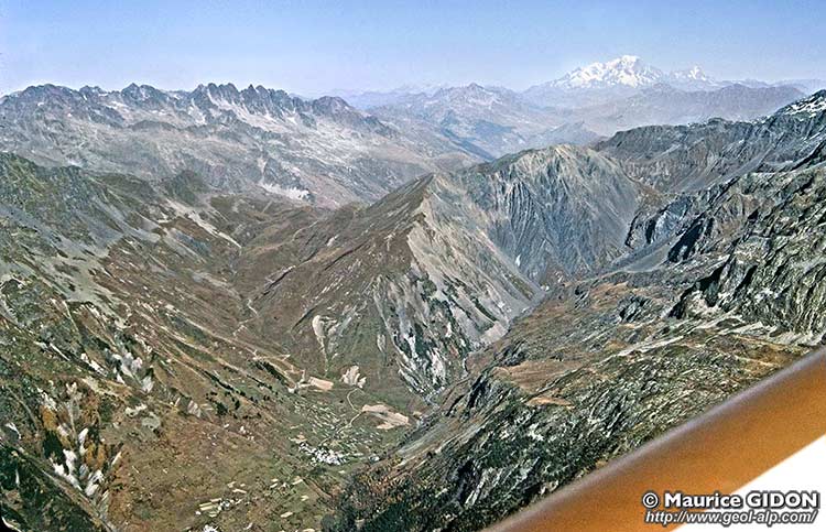 Au nord-est de Vaujany la couverture sédimentaire de la bordure nord-ouest du massif des Grandes Rousses affleure plus largement qu'au sud, car elle est conservée dans le petit chaînon transversal des Aiguillettes : ce dernier n'est autre qu'un chevron* d'érosion qui fait saillie vers l'est en reposant sur la pente de la surface de la pénéplaine anté-triasique.