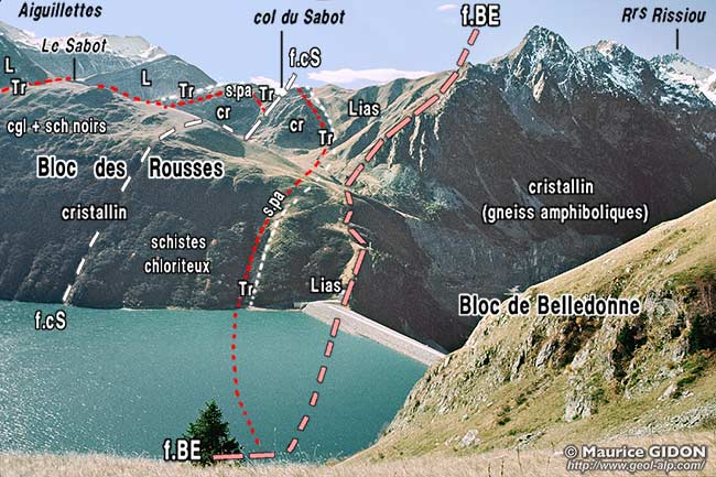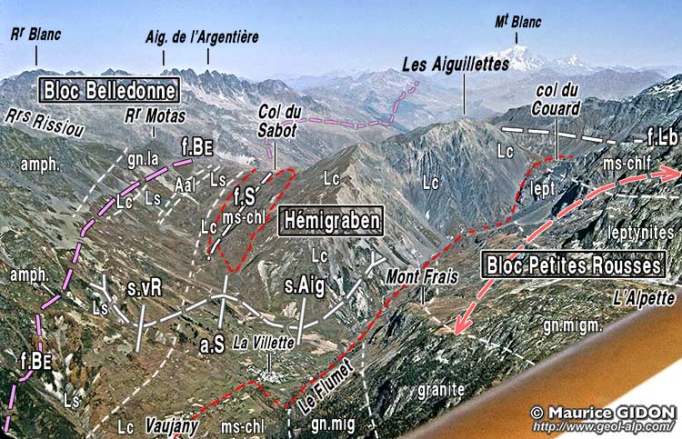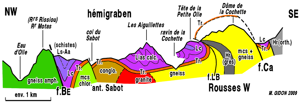 ![]() Coupe d'ensemble de l'hémigraben de Bourg-d'Oisans, à la latitude du col du Sabot f.BE = faille orientale de Belledonne = prolongement septentrional de la faille du col d'Ornon (= f.Co) ; f.LB = faille du Lac Blanc (cassure extensive rabattue vers la gauche dans sa partie la plus élevée) ; f.Ca = faisceau de failles de Cassini = "accident" (graben) médian des Rousses. mcs chlor = micaschistes chloriteux et graphiteux associés aux conglomérats (formation du Sambuis et du Taillefer) ; le granite qui est représenté est visible au sud de Vaujany mais en fait masqué au niveau de cette coupe ; il a tout pour représenter le prolongement méridional de celui de Saint-Colomban). |