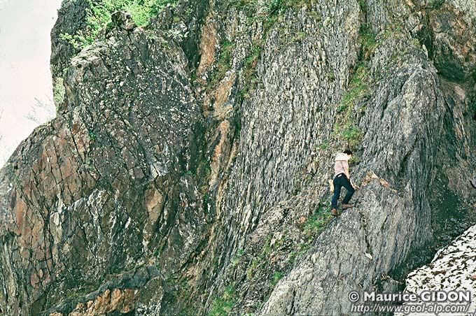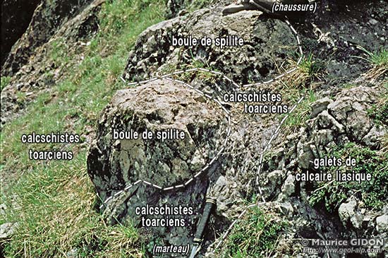 ![]() Aspect des inclusions présentes dans les calcschistes toarciens du soubassement de l'olistolite principal. Le cliché montre deux boules de spilites triasiques au sein de calcschistes toarciens contenant aussi un amas de galets décimétriques de Lias calcaire. |