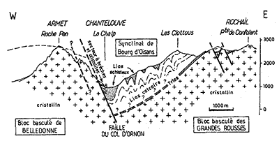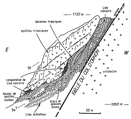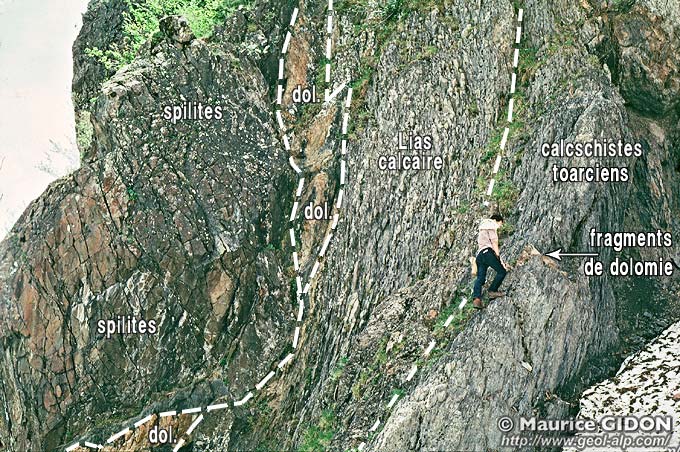 Leur étude montre en outre que ce matériel est constitué d'énormes blocs, de nature variée, qui s'empilent et recouvrent des lits de bréches et de conglomérats ou passent latéralement à ces derniers Comme le tout est interstratifié du côté aval dans des marnes datées du Toarcien il s'agit d'olistolites* effondrés depuis la lèvre supérieure de la faille au cours de la sédimentation toarcienne.