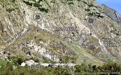 Au pied de ces dalles on observe en plusieurs endroits des placages de matériel sédimentaire appuyés contre le mur de roches cristallines du miroir de faille (groupes d'affleurements numérotés "1a" et "1b" sur la carte de localisation en fin de page).