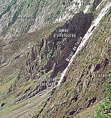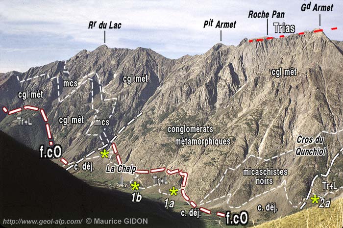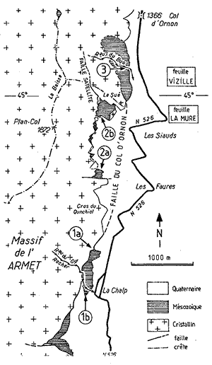 ![]() La rive ouest de la vallée amont de la Malsanne; vue d'ensemble du nord-est, depuis les pentes du Grand Renaud (suite, vers le sud, du cliché de la page "col d'Ornon"). f.cO = faille du col d'Ornon : la dénivellation entre le Trias des crêtes de l'Armet (en rouge) et le fond de vallée est de 1600 m. Les astérisques jaune-vert désignent les amas d'olistolites du pied des abrupts et leurs numéros, 1a, 1b et 2a, se réfèrent à ceux de la carte de la fin de page. |