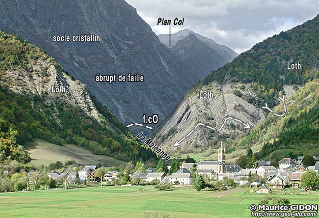Le prolongement de la faille du col d'Ornon vers le sud, jusqu'en Beaumont, est une hypothèse qui n'est pas absolument vérifiée, mais dont la vraisemblance est étayée par le fait que l'on ne voit pas quelles pourraient être les raisons de la disparition aussi brutale, à la latitude du confluent Malsanne - Bonne, d'une cassure aussi importante. Compte tenu de l'orientation de son tracé, la faille du col d'Ornon devrait se poursuivre vers le sud, au delà du cours de la Malsanne, dans le flanc ouest de la montagne du Vet. Or les levés concernant le socle cristallin de cette montagne (par P.Gibergy : carte géologique, feuille La Mure) ne l'y indiquent pas ... Toutefois ces levés ont été fait avant que cette hypothèse ait été formulée, ce qui laisse la possibilité que cette cassure y soit restée inaperçue, surtout si l'on prend en compte la difficulté d'accès de affleurements concernés. |