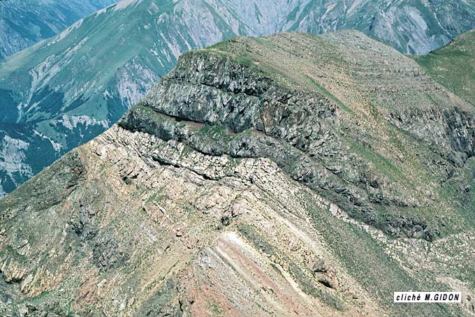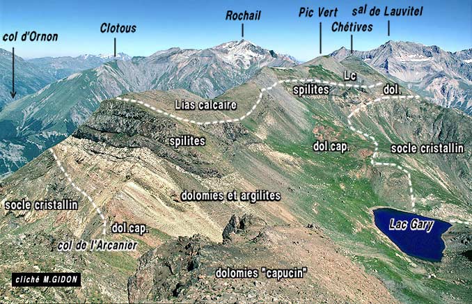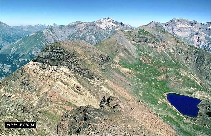 ![]() La crête du Pic Vert (chaînon de l'Arcanier) et le Lac Gary vue du sud-ouest, d'enfilade, depuis le sommet de l'Arcanier (affleurements triasiques du premier plan). Les couches alternées de dolomies et argilites du Trias recouvrent directement la surface de la pénéplaine* anté-triasique, qui dessine ici une légère ondulation synclinale, au flanc méridional (droit) de laquelle est logé le Lac Gary (il est retenu derrière un verrou de roches cristallines). Ces couches supportent plusieurs coulées superposées de spilites, sur lesquelles se sont directement déposés les calcaires du Lias inférieur. |