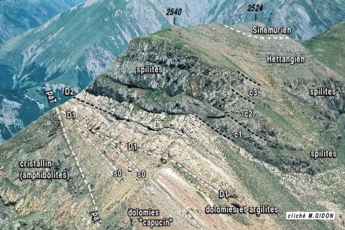 ![]() La base de la série stratigraphique mésozoïque de la crête du Pic Vert Extrémité méridionale de la crête, vue du sud depuis l'Arcanier (en arrière-plan les pentes des Clottous). Cette coupe naturelle est très représentative de la succession stratigraphique de ce secteur, en ce qui concerne les couches du Trias et du Lias inférieur. paT = surface de la pénéplaine* anté-triasique (ici assez fortement inclinée vers le sud-est). Les couches de dolomies et argilites (alternées) qui se sont déposées dessus (s0 = surfaces de stratification) ont subi des basculements vers l'est au cours même de leur dépôt. Ceci est à l'origine des 2 discordances*, notées D1 et D2, visibles au sein de cette succession (D2 s'atténue rapidement vers la droite). Trois coulées de laves (spilites*) superposées (c1, c2, c3) terminent les dépôts triasiques. |