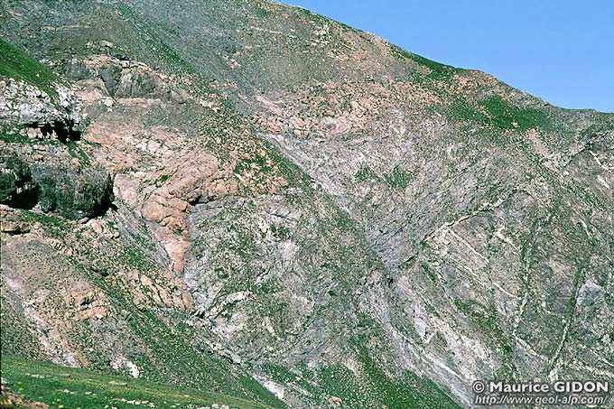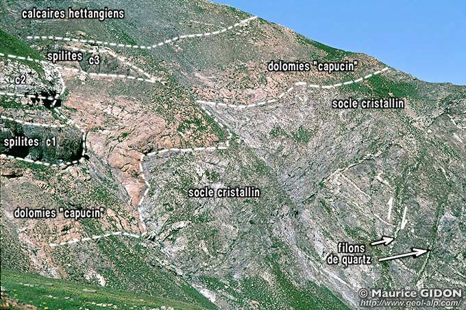 Des dispositions des couches en onlap* et en discordances internes* y attestent à la fois de l'existence d'aspérités à la surface de la pénéplaine anté-triasique et de mouvements de basculement de cette dernière pendant la sédimentation et pendant l'épanchement des coulées de spilites.