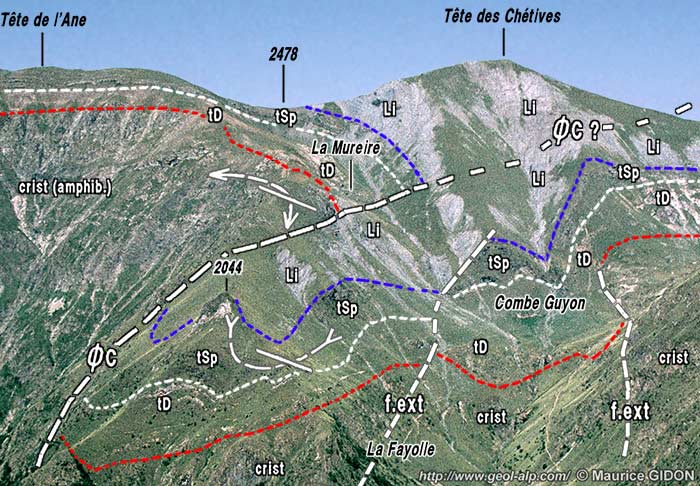 C'est ainsi que les crochons de chevauchement du Clot Vert (versant NW) et de La Mureire (versant SE) semblent bien se correspondre et sans doute se raccorder "en tunnel" sous la crête. Pourtant leurs axes n'ont pas la même orientation et les directions de chevauchement qu'ils indiquent sont divergentes, vers le NW pour le premier et vers le NE pour le second.