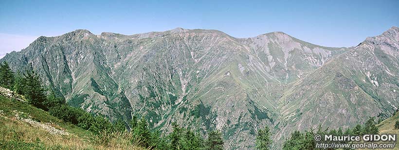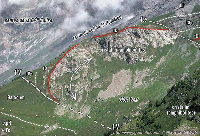 ![]() Le versant sud-ouest de la crête du Pic Vert vu du nord-ouest, depuis le point coté 2159 de la crête de Beauregard. f.V = faille du Vet : noter, dans la moitié gauche du cliché, l'apparition, sous sa surface de cassure, de la bande de calcschistes bajociens qui se prolonge jusqu'au ravin du col de la Roméïou (ces couches reposent sur le lias supérieur par l'intemédiaire d'un mince niveau de calcaires du Petit Renaud. |