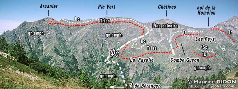 1/ La cassure qui affecte le côté septentrional s'avère représenter clairement l'extrémité NE de la faille du Vet (qui surhausse la crête de l'Arcanier par rapport à la dépression du Périer). On la suit jusque sur l'éperon septentrional de la Tête des Chétives.