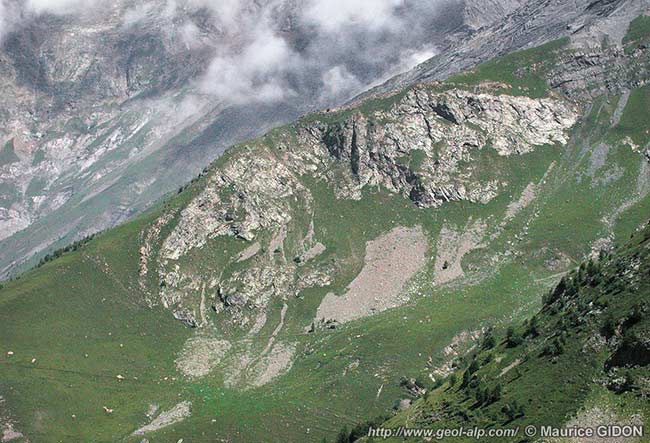 Dans le flanc nord de la Tête des Chétives (premier cliché de la page) le prolongement du tracé de cette cassure est repérable par la présence d'une bande de schistes du Lias supérieur et de Jurassique moyen qui traverse les ravines des Charanches sous le Lias calcaire de la pyramide sommitale. Elle se suit vers le NE jusqu'à l'échine de La Temple, où elle se perd en atteignant la bande de Terres Noires qui détermine le ravin, orienté orthogonalement, qui descend vers le NW depuis le col de la Roméïou, au pied sud-ouest des Rochers de la Grande Église. |