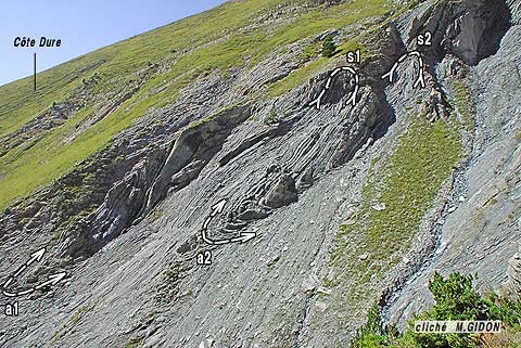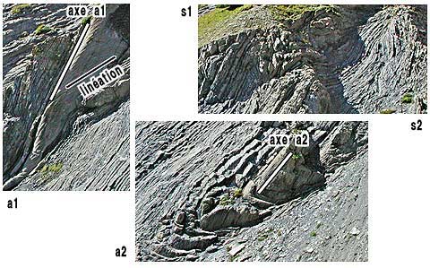Détails agrandis des plis de l'affleurement représenté ci-dessus. Noter le fort plongement vers la gauche (vers le sud) des axes des deux anticlinaux a1 et a2 et l'enroulement par a1 d'une linéation (moins pentée vers le sud). |