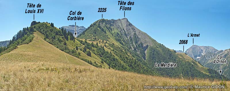 La crête de la Tête des Filons, qui se détache vers le nord pour séparer le vallon du col d'Ornon de celui de Villard-Reymond, est fondamentalement une voûte anticlinale (donc un relief "conforme") mais elle est accidentée de nombreux replis N-S : elle prolonge vers le sud l'anticlinal de Prégentil (voir la page "Villard-Reymond"). A la latitude de ce village la voute de ce pli subit un ensellement transversal marqué qui constitue le synclinal de Corbière : son orientation porte à se demander si ce pourrait être un témoin du plissement E-W bien connu en Dévoluy ...