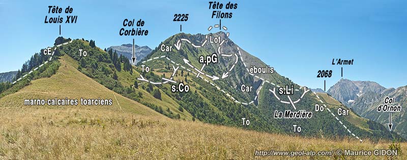 ![]() Le versant occidental de la Tête des Filons vu de l'ouest, depuis l'arête sud du Taillefer (crête des Mayes) a.PG = anticlinal de Prégentil ; s.L = synclinal de la Lignarre (le coeur du synclinal, où affleurent des schistes domériens, détermine le replat du point 2068 On distingue assez nettement, à leur changement de teinte, les divers niveaux du Lias calcaire (cf. colonne stratigraphique). |