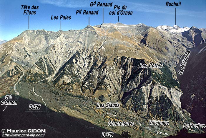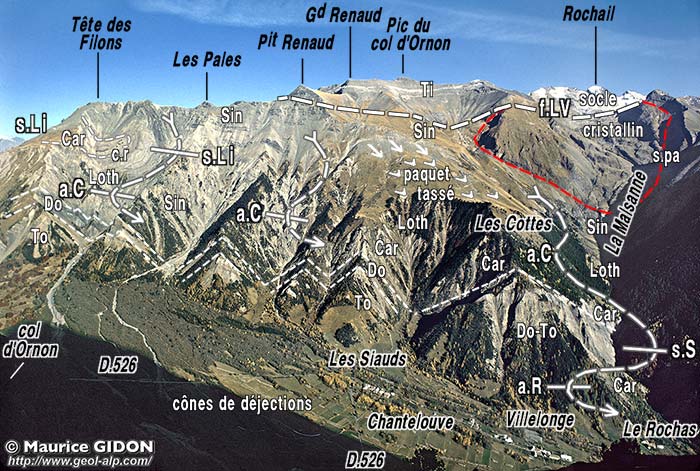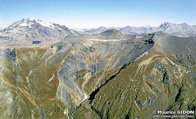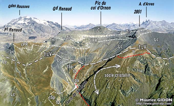 ![]() La partie supérieure du versant sud-ouest du Grand-Renaud vue d'avion, depuis l'aplomb de Chanteloube (au fond les Grandes Rousses et les Aiguilles d'Arves). Le grand ravin de la Chave, qui descend du Pic du col d'Ornon, montre l'enfoncement vers la gauche (c'est-à-dire vers le nord), sous son enveloppe liasique, de la demi-voûte dessinée par la surface du cristallin. Cette voûte est coupée du côté est (amont) par la faille du Lac du Vallon (voir détails ci-après) : celle-ci se perd vers le nord (vers la gauche), dans les couches du Lias calcaire qui la "cachètent" mais réapparaît sur l'autre versant de la crête sous la forme de la faille de la Combe du Grand Renaud. |