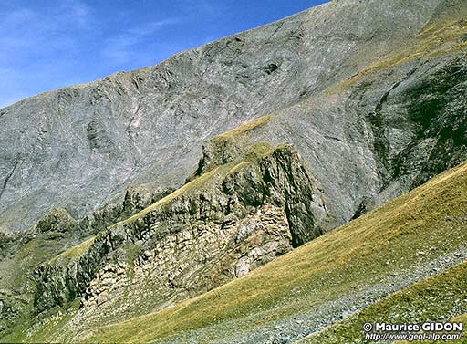 La couverture sédimentaire, très ravinée dans le bas du versant, est l'objet, dans les alpages de ses parties hautes, de plusieurs tassements superficiels qui y déterminent à plusieurs niveaux des ressauts et même des crevasses.