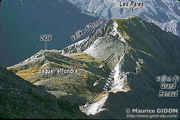 ![]() Crevasses de tassement sur la crête des Pales, vues de l'est, depuis le Petit Renaud. La crête est ici dédoublée par une crevasse à moitié comblée d'éboulis frais. La partie située à gauche s'affaisse en bloc, en glissant vers la vallée de Chantelouve (col d'Ornon). À terme ce mouvement pourrait s'amplifier et donner lieu à l'effondrement de tout un pan de montagne. |