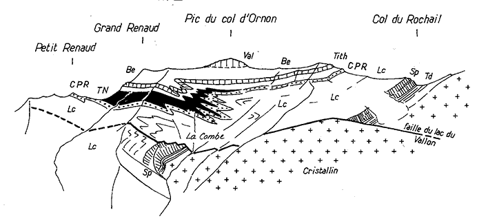 Noter que le tracé de la faille du lac du Vallon se perd vers le nord à la latitude du Petit Renaud : plus au nord elle s'amortit apparemment dans le flanc ouest du synclinal de Villard-Reymond, au niveau duquel elle est vraisemblablement cachetée par les calcaires du Petit Renaud.