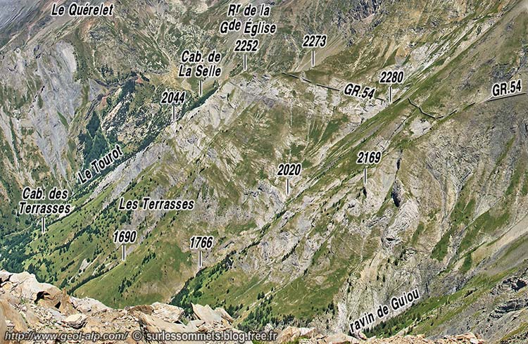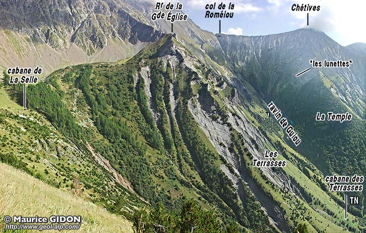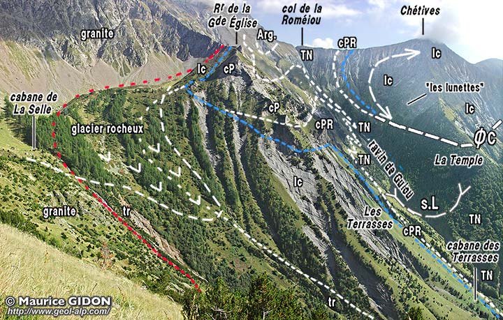 ![]() Les rochers de la Grande Église et le vallon de Guiou vus du nord-ouest, depuis le col du Paletas cPR = calcaires du petit Renaud ; cP = calcaires du Paletas. s.L = synclinal du Lac Labarre ; ØC = chevauchement des Chétives ; "les lunettes" désigne l'emplacement de la charnière du crochon de ce chevauchement dans le Lias calcaire (voir cliché rapproché). Le glacier rocheux de La Selle, formé de matériel cristallin, masque la charnière synclinale qui renverse les couches du Trias et du Lias (fort réduit en épaisseur) au niveau du sommet de la Grande Église. |