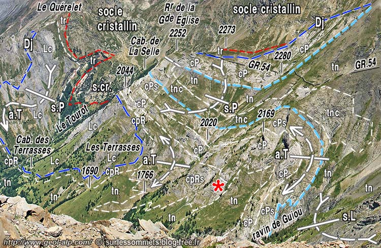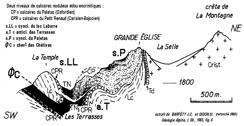 ![]() Les pentes méridionales des Rochers de la Grande Église, vues du sud-ouest depuis la Tête des Chétives (cliché original obligeamment communiqué par l'auteur du site "Sur les Sommets"). Le flanc oriental du synclinal du Lac Labarre (s.L) est accidenté de replis qui affectent la succession réduite qui s'appuyait sur le socle cristallin (du côté droit du cliché celui-ci est renversé sur sa couverture sédimentaire) s.P = repli synclinal du Paletas ; a.T = repli anticlinal des Terrasses ; Dj (en bleu foncé cerné de blanc) = surface de discordance du Jurassique médio-supérieur, sur le Lias inférieur, sur le Trias ou sur le socle cristallin. Succession stratigraphique des termes auxquels, d'ouest en est, les Terres Noires passent latéralement (de haut en bas) : tnc = Terres Noires à lits de calcaires noduleux ; cPs = calcaires du Paletas supérieurs, à litages marneux ; cP = calcaires du Paletas massifs ; cpRs = calcaires supérieurs du Petit Renaud, noduleux alternés de lits marneux ; cpR = calcaires du Petit Renaud, noduleux et à encrines. La partie inférieure du cliché montre les indentations entre les Terres Noires et ces formations, qui correspondent au passage latéral des unes aux autres. L'astérisque rouge localise le détail représenté à la photo suivante. Interprétation illustrée par la coupe ci-après (voir aussi ces pentes sous un autre angle à la page "Paletas") |